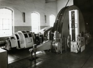 Das Maschinenhaus für eine elektrische Kraftzentrale wird gebaut, etwa auf dem Grund des ehemaligen Hofes Stäffling.