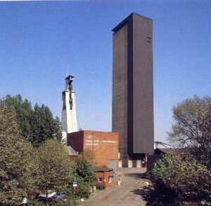 Abbruch des Malakow-Förderturmes von Consolidation Schacht 3. 22.8.1974 Grundsteinlegung für den neuen Beton-Förderturm über Consolidation Schacht 3.